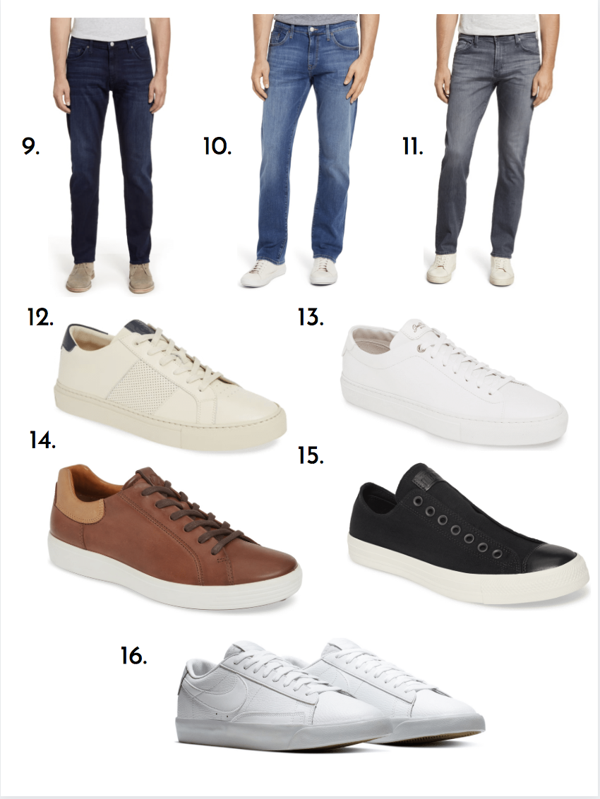 What I like best about all of the items above is that the pieces are interchangeable. The long sleeve shirts and hoodies can be worn with the vests or the bomber jacket. Add in a pair of jeans and sneakers of your choice from the second image to complete the outfit. You’ll be fashion forward pairing denim with a white sneaker this fall. But if that is outside your comfort zone (though I urge you to try) a brown or dark sneaker will also work.