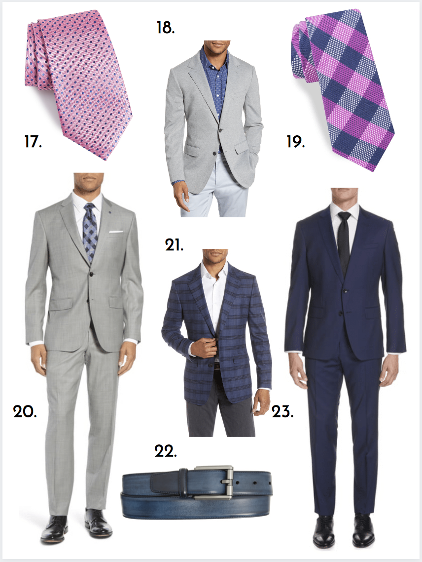 Shopping Details: 17. Pink Dot Tie | 18. Bonobos Knit Sport Coat | 19. Ted Baker Silk Plaid Tie | 20. Ted Baker Wool Suit, $499.90 | 21. Wool Plaid Sport Coat | 22. Leather Belt | 23. Hugo Boss Navy Suit, $598.90