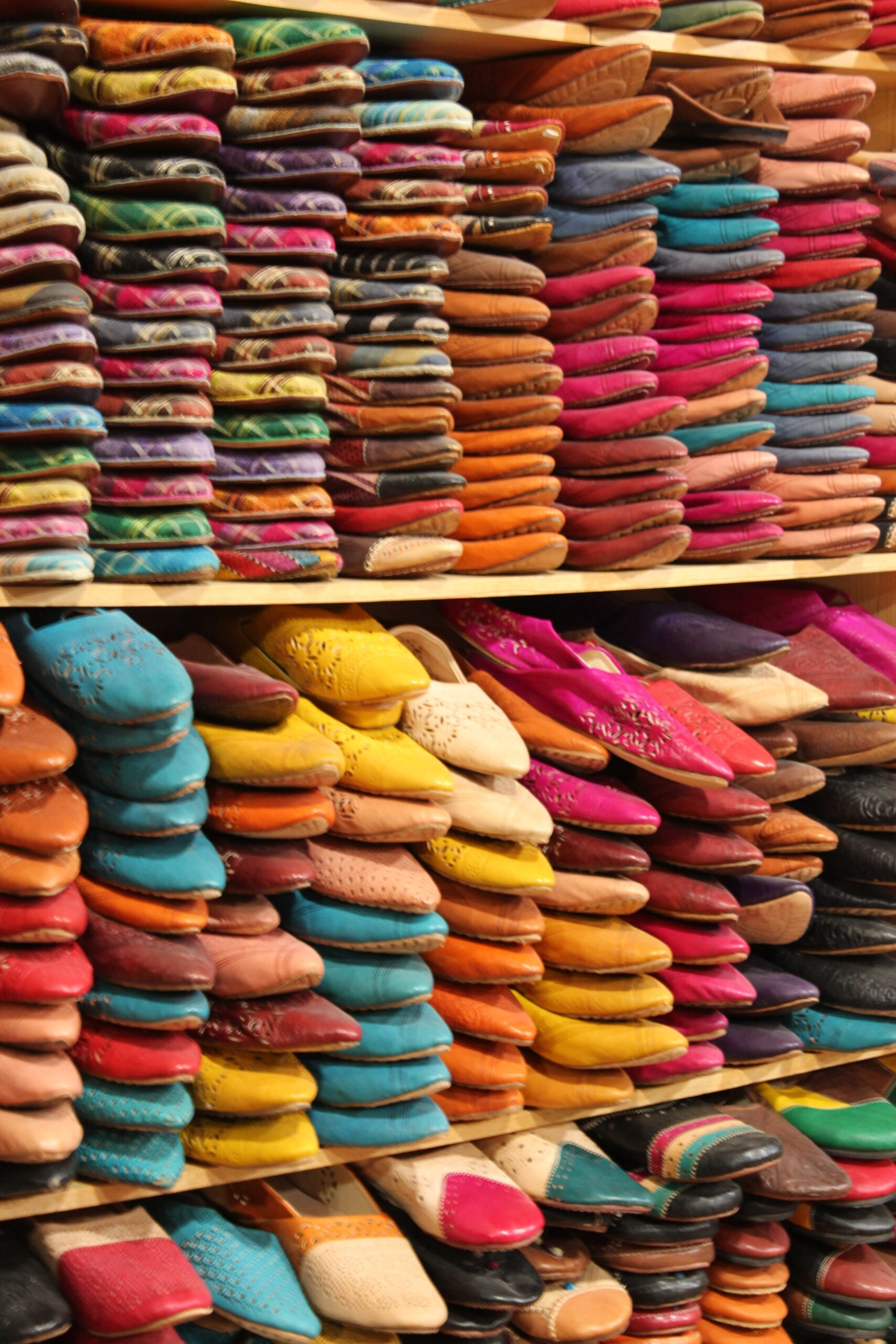 The Chouara tannery is the largest one of the three remaining tanneries in Fes.The same system people used to dye the leather 1000 years ago is still used today. The dyes are all natural and very stinky! From a birds eye view above you can see the process at work.